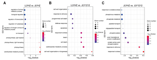 Gene ontology (GO) analysis of the biological process of up-regulated genes in spikelets at flowering stage between LLYHZ and JLYHZ (A), between LLYHZ and JLY1212 (B), and between JLYHZ and JLY1212 (C).