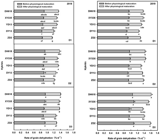 Changes in grain dehydration rate before and after physiological maturity of different cultivars at different densities in 2018 and 2019. Different letters on the graph indicate significant differences at p < 0.05.