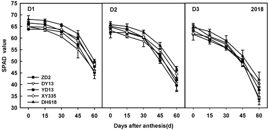 As can be seen from Figure 4 that the SPAD value of leaves after the silking of hybrids of different ages was significantly higher in the 2010s than in the 1970s–2000s. With the development of the growth process, the SPAD value decreased significantly, and the decline was more rapid after 30 days of silking. From 30 to 60 days after silking, the SPAD value of hybrids decreased by 15.6, 14.9, 14.4, 14.1 and 14.3, respectively, under a low density. Under a medium density, the values of SPAD decreased by 18.2, 17.5, 15.7, 15.3 and 14.7, respectively, while under high density, they decreased by 20.8, 21.0, 17.7, 16.1 and 16.0, respectively.