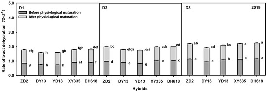 Dehydration rate of bracts of different hybrids under different densities in 2018 and 2019. Different letters on the graph indicate significant differences at p < 0.05.