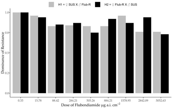 Dominance of resistance to flubendiamide in H. armigera as a function of dose. Reciprocal crosses represented by H1 (♀ SUS × ♂ Flub-R) and H2 (♀ Flub-R × ♂ SUS).