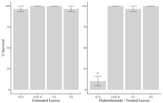 Proportion of larval survival by susceptible (SUS), resistant (Flub-R) and heterozygous H1 (♀ SUS X ♂ Flub-R) and H2 (♀ Flub-R X ♂ SUS) H. armigera in soybean leaves untreated and treated with flubendiamide (0.33 μg a.i. cm−2). * Significant difference between strains according to the Tukey’s test (p < 0.05).