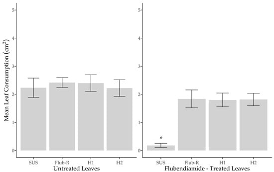 Mean leaf consumption by susceptible (SUS), resistant (Flub-R) and heterozygous H1 (♀ SUS X ♂ Flub-R) and H2 (♀ Flub-R X ♂ SUS) H. armigera larva in soybean leaves untreated and flubendiamide-treated (0.33 μg a.i. cm−2). * Significant difference between strains according to the Tukey test (p < 0.05).