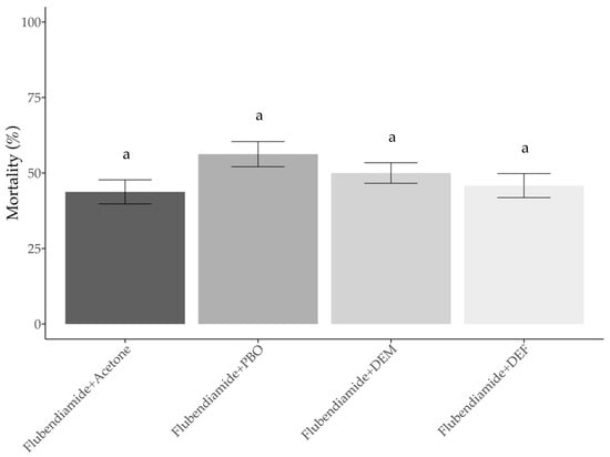 Effect of synergists (PBO, DEM and DEF) on H. armigera (third-instar larvae) mortality to flubendiamide. Bars fallowed by the same letter do not differ from the treatment control (flubendiamide + acetone) according to the Tukey’s test (p > 0.05).