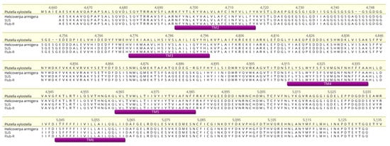Multiple alignments of partial ryanodine receptors, spanning transmembrane II to VI. This region harbors the main mutations related to diamide resistance. Alignment was performed based on the H. armigera sequence (GenBank AHB33498). No mutations were found in the flubendiamide-resistant strain (Flub-R). The sites are numbered according to the sequence of P. xylostella (GenBank AET09964).