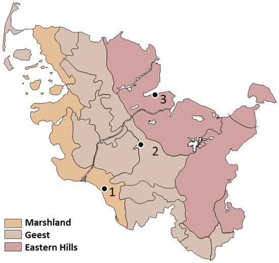 Study site locations in Schleswig-Holstein, with locations 1 = Marshland, 2 = Geest and 3 = Eastern Hills.