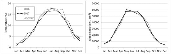 Average monthly temperatures (left) and global radiation (right) for 2016 and 2017, and the long-term mean (1981–2010) from meteorological stations near the study sites.