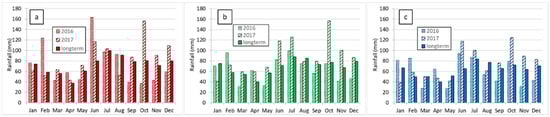 Monthly rainfall for 2016 and 2017, and the long-term mean (1981–2010) from the three meteorological stations near the study sites (a) Marshland, (b) Geest, and (c) Eastern Hills.