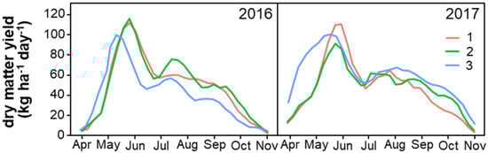 The measured patterns of biomass growth throughout the vegetation period (March to November) represent the typical seasonal growth in temperate climate regions with a characteristic asymmetric curve. Due to the above-average precipitation during summer of the experimental years, there were only slight drought-related growth deficits after the first growth peak in spring, with only short growth depressions in summer (June–July). The high precipitation also meant that annual yields between the sites were similar, ranging from an average of 10.9 to 11.6 t DM ha−1, as the PAW of the soil had negligible effects. Sufficient precipitation and above-average temperatures in spring and autumn, especially in 2017, led to an extension of the growing season. However, the generative growth of the grass sward in spring is the key factor for the high annual yield levels [47]. Under non-limiting growth conditions such high yields of perennial ryegrass are common, for example, Cashman et al. [48] observed average annual yields of 11.7 t DM ha−1 under similar experimental conditions in Ireland under simulated grazing with 10 cuts with annual N fertilization of 350 kg N ha−1. High inter-annual yield variations, due to precipitation and temperature [49,50], however, need to be accounted for in the planning of feeding strategies.