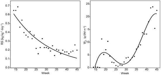 Measured (dots) and fitted values for the biomass at the start of each growth period (W0; g m−2) and the relative growth rate (RS; kg kg−1 day−1) over the vegetation period, using a fourth-degree polynomial function as a function of the week of the year for W0 and an exponential function for RS.