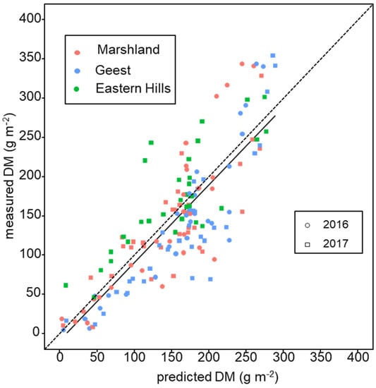 Measured vs. predicted pasture biomass of different cuts for two years (2016 and 2017) and for the three main landscape types of Schleswig-Holstein (Marshland, Geest, and Eastern Hills) based on weekly measurements of dry-matter yields using a rising plate meter and calculated as the moving average of four consecutive measurements following Corrall and Fenlon [35].