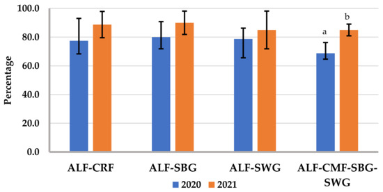 In comparison, the total DMY of ALF-CMF (4.2 Mg ha–1), ALF-SWG (3.2 Mg ha−1), and ALF-SBG (3.5 Mg ha−1), in the current study, were lower than in a study conducted in Wyoming, USA [15], with ‘Garrison’ creeping foxtail in mixture with alfalfa (10.1 Mg ha−1), with ‘Lutana’ cicer milkvetch (6.5 Mg ha−1), and with ‘Eski’ sainfoin (4.0 Mg ha−1).