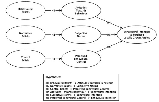 The Theory of Planned Behavior (TPB) was developed by the social psychologist Icek Ajzen and has been applied to a variety of different products and consumer decision-making situations [45]. The TPB postulates that the behavior of individuals (in this case, an apple consumer) is determined by their intentions to undertake this behavior, which in this instance is buying local apples [46]. Intentions build on attitudes, subjective norms, and perceived behavioral control [45]. Ajzen (1991) states that an attitude refers to a consumers’ beliefs regarding their behavior; these beliefs can be either positive or negative in nature [46]. Three types of beliefs are distinguished, namely behavioral beliefs, normative beliefs and control beliefs [45,46,47]. Behavioral beliefs express themselves as attitudes related to the behavior of interest. This type of belief is determined by the perceived consequences of participating in the behavior, and an evaluation of the consequences of enacting on this behavior [47,57]. For instance, a consumer may believe that buying local food is good for them as it improves their health and wellbeing. However, they may also perceive buying local as more time consuming and/or more expensive compared to shopping elsewhere. Similarly, normative beliefs manifest as a subjective norms, which relates to perceived social pressures stemming from an individual’s social environment [47,57]. This includes colleagues, family and friends [56]. Normative beliefs are closely associated with ethical decision-making, and are a significant predictor for purchasing local or organic foods [48]. Emotions such as fear or guilt are associated with normative beliefs [58].