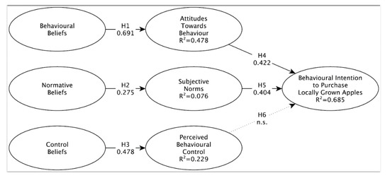 The model can be deemed to be an adequate fit due to having a GoF of 0.500, an NFI of 0.744, and an acceptable SRMR of 0.072. The average R2 values were 0.367, indicating that the model has an acceptable but weak-to-moderate explanatory power, and average Q2 values were 0.362, indicating moderate-to-strong predictive relevance. Given that there was adequate model fit, and a weak-to-moderate explanatory power medium for a strong predictive relevance, the structure of the model was confirmed to be acceptable for hypothesis testing, with the results shown in Table 4 and Figure 2. As anticipated, behavioral beliefs significantly impact attitudes towards behavior, normative beliefs significantly impact subjective norms, and control beliefs impact perceived behavioral control, supporting H1, H2 and H3. Additionally, H4 and H5 found support because attitudes towards behavior and subjective norms significantly impact US consumers’ intention to purchase apples locally. Perceived behavioral control was not found to be a significant factor; therefore, H6 is not supported.