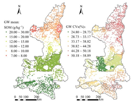 Global descriptive statistics for the SOM content revealed that the average SOM content was 15.63 g·kg−1, thus signaling that SOM content was slightly enriched during the past decades compared with 10.7 g·kg−1 in the 1980s []. Additionally, the global variation coefficient of SOM content was 49.65%, thus indicating moderate variation intensity.