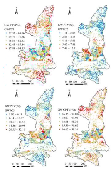 As indicated by the cross-validation results, the optimal adaptive bandwidth of GWPCA was 982, and this was less than the total number of sampling points (4878), thus signifying a strong spatial variation in auxiliary variables. Under the current bandwidth (i.e., 982), the PTV for GWPC1 ranged from 57.33~94.15 (Figure 3), with low values in GZP and southern LPR and high values in northern and southern Shaanxi. However, the PTVs for GWPC2 and GWPC3 were much lower than that for GWPC1. GW CPTV of the first three GWPCs was typically greater than 92.03%, thus indicating a vast variation in the auxiliary variables that were selected by the geo-detector. The remaining GWPCs were then discarded.