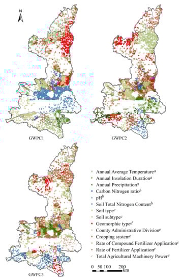 All of the GW winning variables (i.e., variables with the highest absolute loadings) for the first three GWPCs are presented in Figure 4. GWPC1 was highly correlated with soil types in DBM, HRB, western QLM, southern LPR, and BSR and with human activities in central and northern LPR, geomorphic types in northeastern LPR, and soil nutrients in GZP, central, and western QLM. GWPC2 was highly correlated with climatic conditions in eastern and western QLM, and soil types in central and western LPR, and with human activities in central and northern LPR, southeastern LPR, and geomorphic types in the BSR. GWPC3 was highly correlated with soil nutrients in the DBM and HRB, human activities and soil types in the GZP, QLM, and central LPR, and human activities in the northern LPR. However, the spatial clustering degree of the winning variables of GWPC3 demonstrated a weaker trend than did those of GWPC1 and GWPC2, and this may be attributed to the lower observation variance for GWPC3. In general, the relationships among auxiliary variables vary spatially.