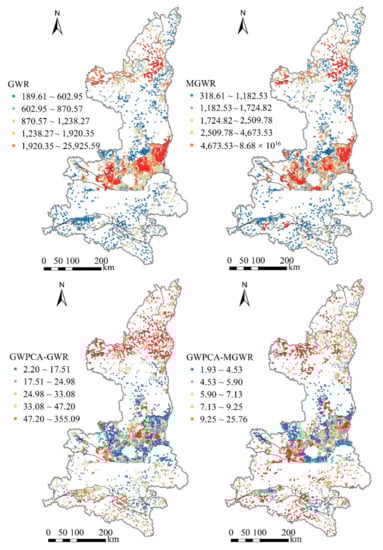 First, the local condition number (CN) is used to measure the local multicollinearity of independent variables, and this may lead to a significant amount of noise and bias in the regression coefficient []. The local CN of MGWR is typically higher than that of GWR; nevertheless, both are significantly larger than GWPCA-GWR and GWPCA-MGWR, thus signifying that multi-collinearity may be problematic (Figure 5). Notably, the local CNs for GWPCA-MGWR were all less than the common threshold of 30 [], thus indicating no local multi-collinearity. This implies that GWPCA captured the spatial non-stationary structures effectively by extracting the local information of auxiliary variables, and also by reducing local collinearity.