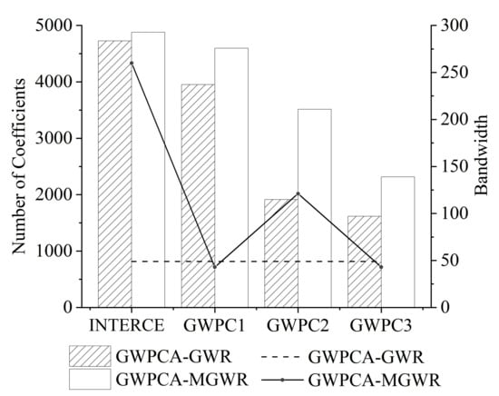 Optimal bandwidths and number of coefficients generated by GWPCA-GWR and GWPCA-MGWR.