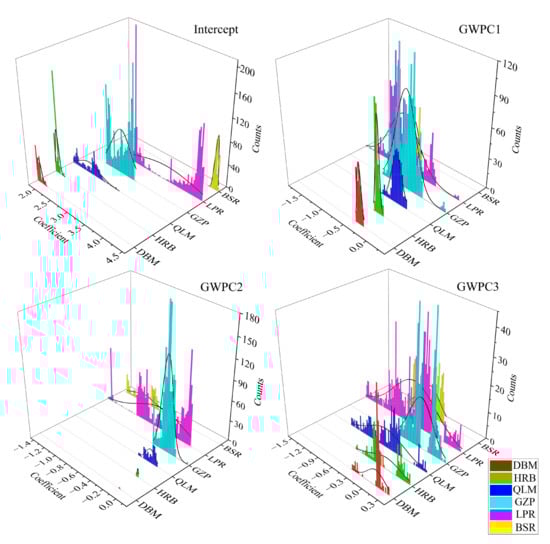 In DBM and HRB, the correlation coefficient of GWPC1 was typically higher than that of GWPC3. GWPC1 was highly correlated with soil type, and GWPC3 was highly correlated with soil nutrient. In QLM, the number and absolute value of correlation coefficients for GWPC1 were significantly higher than were those for GWPC3 at the level of 0.05, where soil types were highly correlated with GWPC1 and GWPC3 in western QLM. Soil nutrients and human activities were highly correlated with GWPC1 and GWPC3 respectively, in the eastern QLM. In GZP, and the regression coefficient of GWPC1 was generally higher than that of GWPC2. This was followed by GWPC3 which generally failed the test in the western and southern GZP at a level of 0.05. GWPC1 was highly correlated with soil nutrients, and soil types in the northeast. GWPC2 was highly correlated with human activities in eastern GZP and with soil types in western regions GWPC3 was associated with human activities in the east generally and with various soil types. In the LPR, GWPC1 possessed a regression coefficient that was higher than that of GWPC2, and this was followed by GWPC3. GWPC1 was generally correlated with human activities in the LPR, with geomorphic types in the northeast and soil types and nutrients in the south. GWPC2 was highly correlated with human activities in the northern and south-central LPR, and with soil types in the north-central LPR. GWPC3 was highly correlated with human activities overall, and soil types in certain regions. In the BSR, it was observed that the correlation coefficients of GWPC1 and GWPC2 were similar and higher than that of GWPC3, and the winning variables were soil type for GWPC1, geomorphic type for GWPC2, and human factor for GWPC3.