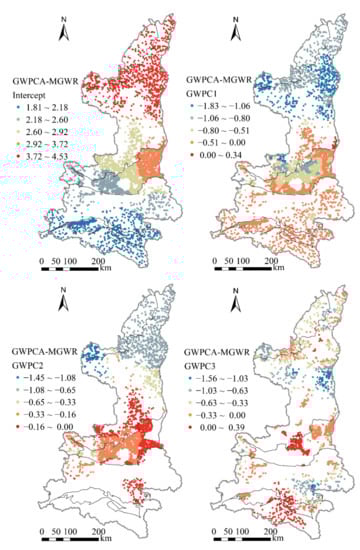 MGWR, an extension of GWR, obtains the spatial relationship according to a distinct spatial scale parameter. The GWPCA-MGWR was calculated as follows: