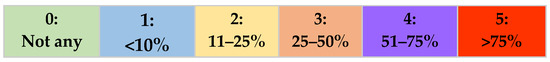 A scale from 0 to 5 was used to score the disease (Figure 2). Disease severity was calculated according to the Townsend–Heuberger Formula = [∑ (no. of plant in category × category value)] × 100/Total no. of plants × max. category value) [39]. In addition, fallen leaves were collected to quantify the fungal attack.