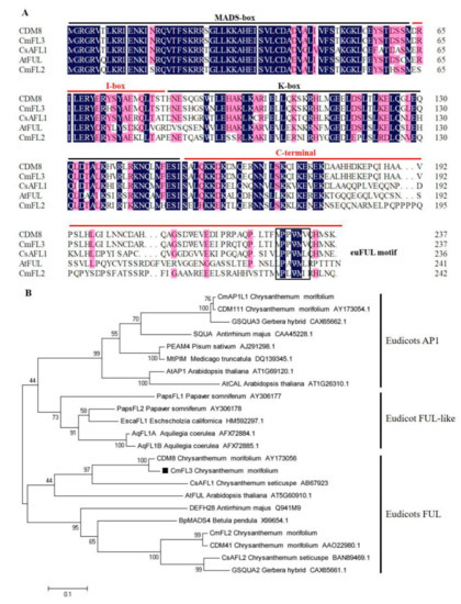 Sequence analysis of CmFL3. (A) Sequence alignment of CmFL3 and homologous proteins. The black color indicates 100% identity; red, 80% identity. Gaps are shown by dots; FUL motif is shown by the black box, and other key motifs are underlined. (B) Phylogenetic tree of AP1/FUL-like subfamily proteins and CmFL3 (black box). Detailed information is shown in the Supplementary Materials. The GenBank accession number of CmFL3 is ON959211.