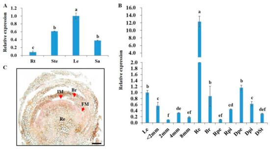 Transcriptional profiling of CmFL3. The relative expression level of CmFL3 in (A) vegetative stage and (B) reproductive stage under short-day conditions quantified using qRT-PCR. In situ localization of CmFL3 in (C) inflorescence bud (diameter < 2 mm). Rt, root; Ste, stem; Le, leaf; Sa, shoot apex; Rpe, ray floret petal; Rpi, ray floret pistil; Dpe, disc floret petal; Dpi, disc floret pistil; Dst, disc floret stamen; IM, inflorescence meristem; FM, flower meristem; Br, bract; Re, receptacle. The IM, FM, and Br (C) are indicated by red arrows. Values (A,B) represent mean ± SE (n = 3). Significant differences were analyzed using Duncan’s multiple range test. Different letters above the bars represent significant differences (p < 0.05). Bar = 200 μm.