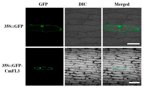 Subcellular localization of CmFL3. GFP, green fluorescence protein; DIC, differential interference contrast; Merged, overlay plots. Bars = 50 μm.