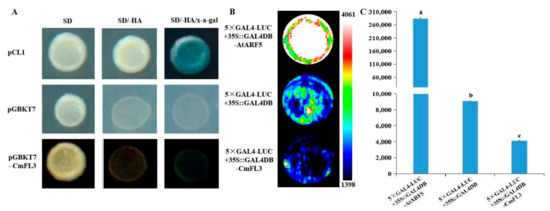 To further examine whether CmFL3 functions as a transcriptional activator, a transactivation assay was conducted in yeast. pCL1 and pGBKT7 were used as the positive and negative controls, respectively. Yeast cells harboring the pCL1 vector grew freely on the SD/-His-Ade medium independent of x-α-gal. In contrast, cells that harbored an empty pGBKT7 vector or either of the pGBKT7-CmFL3 plasmids did not grow on either medium (Figure 4A). Therefore, these experiments indicate that CmFL3 shows no transactivation activity in yeast.