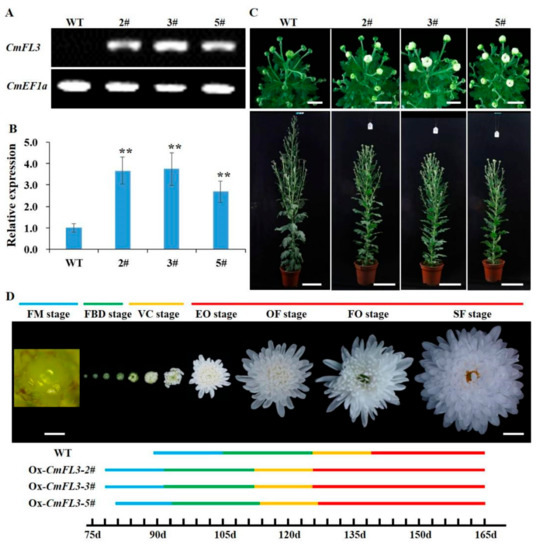 To characterize the biological function of CmFL3 in chrysanthemum, the construct carrying the CaMV 35S promoter followed by the CDS of CmFL3 was transformed into ‘Jinba’ [52]. Three transgenic lines (Ox-CmFL3) were selected, which were confirmed using the forward primer from the pMDC-43 vector and reverse primer from the CDS. Their relative expression levels were determined through qRT-PCR using CmFL3 specific primers (Figure 5A,B), and the phenotype was observed at different stages (Figure 5C,D).