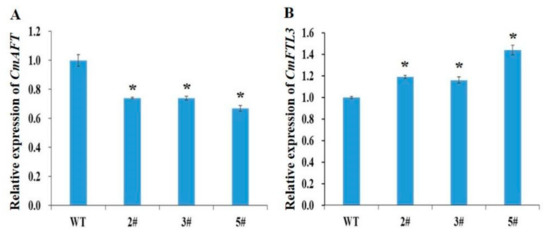 In chrysanthemum, many genes, such as CmAFT and CmFTL3, are involved in flowering [21,53]. We further examined the expression levels of these genes in the Ox-CmFL3 transgenic lines (2#, 3#, and 5#) and WT plants using qRT-PCR. The results showed that the flowering promoter gene CmFTL3 was upregulated, whereas the flowering repressor factor CmAFT was downregulated in the leaves of the Ox lines (Figure 6A,B). Thus, the data showed that CmFL3 induces flowering by upregulating the expression of CmFTL3 and downregulating the expression of CmAFT in chrysanthemum leaves.
