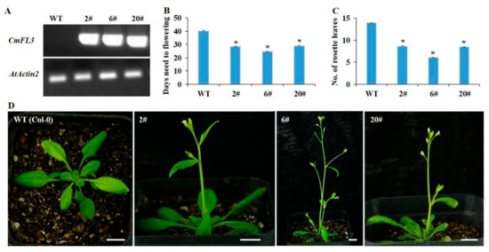 Phenotypic observation of the WT and CmFL3-overexpressing transgenic Arabidopsis plants. (A) The abundance of CmFL3 in the transgenic and WT plants. (B) The number of days to bolting. (C) The number of rosette leaves produced at bolting. (D) The phenotype of the plants at bolting. The values represent means ± SE (n = 15), and the significant differences were determined using Student’s t test (* p < 0.05). Bars = 1 cm.