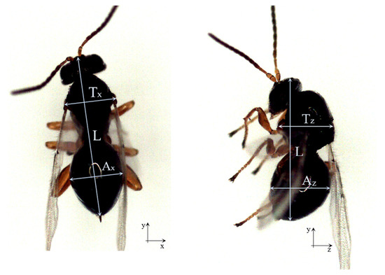 To facilitate the manipulation of the wasps, the insects that were captured in the cages were placed in a Petri dish and then anesthetized with a few drops of chloroform. The anesthetized insects were then arranged in groups of ten individuals on a slide to capture the images. On these images, the length, the thorax and abdomen width (dorsal view (x-axis), and a lateral view (z-axis)) were measured for each of the analyzed insects (Figure 2).