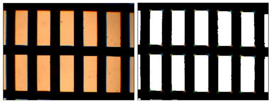 The measurement of the hole size of the protection textiles was performed on digital images using the software Euclides v.1.4 [33,34]. The digital images (Figure 3) were taken using a Motic DMWB1–223 microscope with an Altra 20 digital camera (Olympus). The calibration of the microscope allowed the evaluation of the equivalent metric units of each pixel. A total of 800 holes per textile were measured. It was necessary to take different image captures of each textile to cover the number of holes since the scanning field was too small, even when using the lowest magnification objective (4×), and only a few holes could be obtained per image, depending on the density of the threads in the sample. The precision of the measurements obtained on the microscopic images corresponded to one pixel and the calibration performed with the microscope for the objective used in the image capture (4×) established a ratio of 8.297 μm pixel−1. Euclides v.1.4 requires black and white images, in which the white pixels correspond to the holes of the textile and the black pixels correspond to the threads (Figure 3). The measurements were based on obtaining the vertices that were defined by the crossing between the threads that made up the screen. The software scanned the image by rows of pixels and was able to identify these vertices. After some corrections, Euclides v.1.4 read the coordinates of these vertices and related them to the hole to which they belonged. With these data, all the geometrical characteristics of the protection screens could be obtained by applying Euclidean geometry. The Euclides v.1.4 software calculated the following geometrical parameters: the number of threads per unit length (density of threads) in the weft and warp directions, the thickness of the threads, the dimensions and surface area of the holes, the textile porosity, and the diameter of the largest circumference inscribed in the holes.