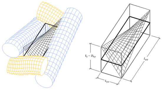 All the above-mentioned parameters describe the screen from the point of view of its orthogonal projection. However, from a microscopic point of view, the spatial arrangement of the threads that make up the textile suggests that this 2D approach is not sufficient to explain the relationship between the screen and the insect. The real surface area that defines the three-dimensional space between the threads is a region of the hyperbolic paraboloid [35], as can be seen in Figure 4. Using the variables that describe the protection screen from the 2D perspective (length Lpy and width Lpx of the hole and thickness of the warp thread Dhy), and considering the thickness of the textile tt measured using a micrometer (model 3050T, Baxlo) according to the standard ISO 5084: 1996 [36], the surface area of the screen measured in 3D can be calculated using the method proposed by [35] as follows: