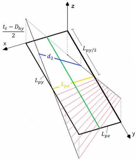 Another parameter that becomes interesting when considering the 3D structure of the textile is the distance d2 that is a generatrix of the 3D hole surface and it is defined as the average spatial separation between the warp threads, considering the middle of the hole from the point of view of its length (Figure 5). Theoretically, the hole width Lpx measured in 2D prevents the entry of the insects if the dimension is smaller than the insect’s body size. However, the hole width Lpx does not change when the hole length Lpy increases (this happens when the distance between the weft threads increases) or when the thickness of the screen varies and, although the 2D surface area increases, it is not relevant from an insect exclusion point of view. However, when the hole length Lpy increases the spatial separation of the warp threads (z-axis) it leaves a gap (3D) through which insects can cross the textile if the gap is big enough. A way to measure this gap and to theoretically know if the insect can pass through the hole is by the 3D surface area A3D and the generatrix d2. This distance can be calculated using the following method proposed by [35]: