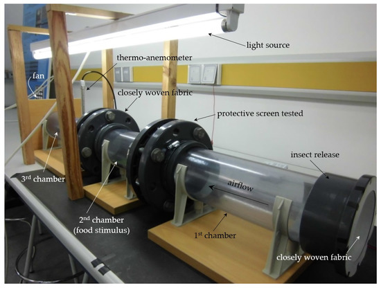 A transparent PVC tube with a diameter of 11 cm was divided into three compartments of chambers. The union between the first and second compartments was achieved by means of a set of flanges between which the textile sample to be analyzed was inserted (Figure 6). The third chamber was joined to the second compartment by another flanged joint, in which a very dense fabric was placed to allow air flow but prevent the passage of insects from the second chamber to the third compartment. A hot wire thermo-anemometer (model HD29V37TC12, Delta OHM, Selvazzano Dentro, Italy) was placed in the third chamber to measure the temperature and air velocity, in addition, a DC fan was placed in this chamber. This fan allowed us to establish an air flow inside the device. The experimental set-up was managed by the Bóreas v.1.3 software that allowed the test variables to be set and the air velocity (which was constant in each test) and temperature to be recorded.