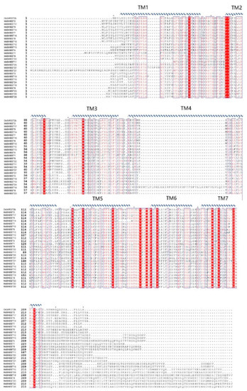 Sequence alignment of MdSWEETs and OsSWEET2b. Sequences of SWEETs were aligned using Clustal X2, and the results were submitted to the Essprint online website (https://espript.ibcp.fr/ESPript/cgi-bin/ESPript.cgi/ (accessed on 10 December 2020)) for visualization. Based on the OsSWEET2b structure, the positions of the seven transmembrane (TM) structural domains (TM1 to TM7) are indicated by wavy lines above the sequence. Conserved amino acid sequences are indicated in red.