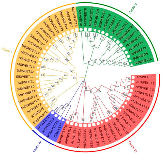 Phylogenetic relationship between SWEET proteins in Arabidopsis, tomatoes, and apples. The phylogenetic tree was constructed based on the amino acid sequences by MEGA X using the NJ method with 1 000 bootstrap replicates. The resulting file was submitted to the EVOLVIEW V2 website (http://www.evolgenius.info/evolview/ (accessed on 10 December 2020)) for mapping. Based on the grouping of SWEET members in Arabidopsis, 27 MdSWEETs were divided into four clades that were labeled as I, II, III, and IV, which are represented by yellow, green, red, and purple, respectively. At, Arabidopsis; Sl, tomatoes; Md, apples.