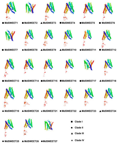 Secondary structure prediction showed that apple MdSWEET proteins were primarily α-helices (35.74–53.97%) and random coils (25.10–42.62%), followed by extension chains and β-turns (Table 2). Further, 23 SWEET proteins had similar tertiary structures, except for MdSWEET2, 7, 17, and 27 (Figure 3).