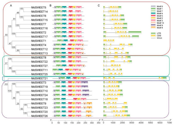 Analysis of conserved motifs and gene structure in the phylogenetic tree of the MdSWEET gene family. (A) Phylogenetic tree of MdSWEETs. Different clades are marked with different colors. Frames in red, green, purple, and blue indicate clades I, II, III, and IV. (B) Conserved motifs predicted in MdSWEET proteins. The conserved motifs were analyzed using MEME v5.4.1 (https://meme-suite.org/meme/tools/meme/ (accessed on 15 December 2020)), and the 10 motifs are represented by squares of different colors and numbered 1–10. (C) Exon–intron structures of MdSWEET genes. Yellow bars: exons; lines: introns; green bars: untranslated region.