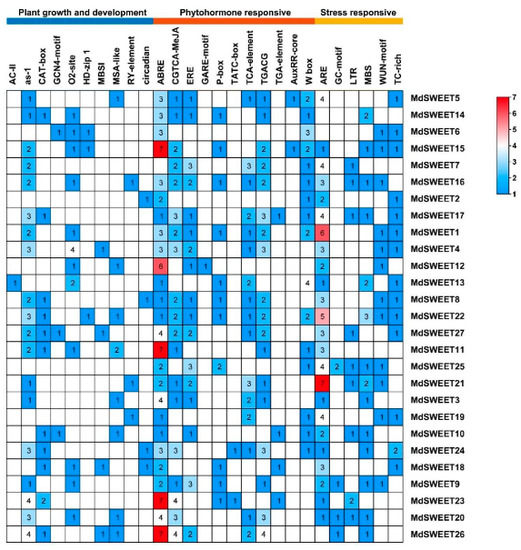 In addition, we performed a tissue-specific analysis of 27 MdSWEET genes and found that 19 MdSWEET genes contained a total of 42 phloem tissue-specific cis-acting elements (as-Ι), 17 genes contained a total of 24 root-specific expression cis-acting elements (W box), 4 genes contained four seed-specific expression cis-acting elements (RY-element and AACA_motif), 2 genes contained two endosperm-specific expression cis-acting elements (GCN4_motif), and 1 gene contained one vascular bundle-specific expression cis-acting element (AC-II; Figure 6). Among these, 14 genes contained multiple tissue-specific expression cis-acting elements simultaneously.