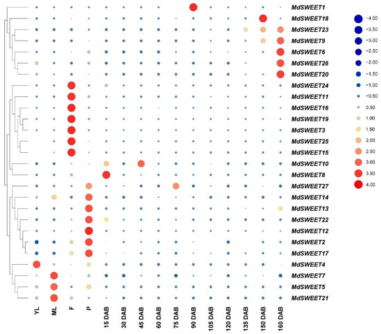 To better understand the potential functions of MdSWEET genes in different developmental stages of apple fruit, the expression patterns of all 27 MdSWEET genes were analyzed every 15 DAB (Figure 7). The expression patterns of MdSWEET genes displayed evident differences during apple fruit development. For example, MdSWEET8 showed a high expression in the early stage of fruit development (15 DAB), whereas MdSWEET10, 27, and 1 were highly expressed in the middle stage of fruit development (45–90 DAB); in turn, the expressions of MdSWEET18, 23, 9, 6, 26, and 20 were sharply upregulated in the late developmental period (150–160 DAB).
