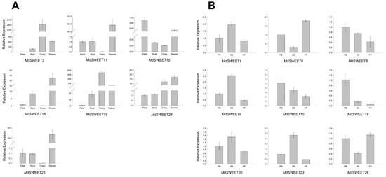 To comprehensively decipher the potential functions of MdSWEETs, the expression of 27 MdSWEET genes in different tissues/organs and developmental stages of apple was detected by qRT-PCR (Figure 7). The results showed that expression of MdSWEET genes was tissue-specific. For example, MdSWEET5, 7, and 21 were strongly expressed in mature leaves (source organ); MdSWEET5 and 7 belong to clade Ι, whereas MdSWEET21 belongs to clade IV. MdSWEET14, 13, 22, 12, 2, and 17 were strongly expressed in peduncles (transport system); all of them belong to clade Ι, except for MdSWEET14 (clade III). MdSWEET4 belongs to clade Ι and was highly expressed in young leaves (sink organs). In turn, MdSWEET24, 11, 16, 19, 3, 25, and 15 were highly expressed in flowers (sink organs), and all of them belong to clade IΙ or clade III, except for MdSWEET15, which belongs to clade Ι. These seven genes that were predominantly expressed in flowers were selected and their expression levels were analyzed in different floral tissues (Figure 8A). The results showed that MdSWEET15 was predominantly expressed in petals; MdSWEET3 and 19 were highly expressed in ovaries, and MdSWEET11, 16, 24, and 25 had the highest expression level in stamens. MdSWEET1, 6, 8, 9, 10, 18, 20, 23, and 26 were strongly expressed in fruits (sink organs). To gain further insight into the possible roles of these nine genes in phloem unloading in apple fruit, we analyzed the expression of these genes in different regions of the fruit (Figure 8B). MdSWEET8, 10, and 18 were highly expressed in PB, whereas MdSWEET1, 9, 20, and 23 showed the highest expression level in SB, and MdSWEET6 and 26 were primarily expressed in FP.
