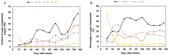 Analysis of the content and proportion of sugar components at different fruit development stages of the “Hanfu” apple. (A) Sugar contents in different fruit stages. Fructose (Fru), glucose (Glu), sucrose (Suc), and sorbitol (Sor) contents were determined by HPLC. Data represent the mean of three biological replicates. (B) Proportions of sugar components in different fruit stages. Error bars: standard deviation (n = 3).