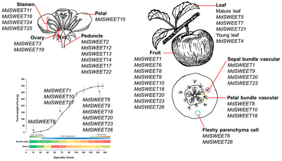 Schematic models of gene expression and roles of MdSWEET proteins in different apple tissues/organs and development stages. The figure shows representative genes that are highly expressed in each tissue. These genes may be involved in sugar transport in young leaves, mature leaves, stamens, ovaries, petals, pedicels, and fruits. Gene names under tissue names indicate that they are highly expressed in these tissues.