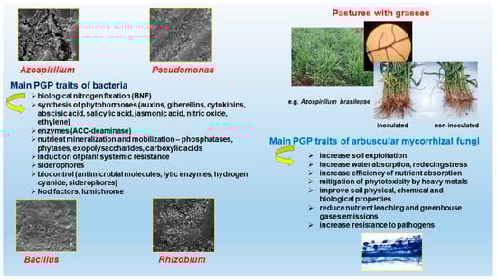 PGPM has been found associated with several species of cereals and forage grasses, with a large number of reported genera, with emphasis on Pseudomonas, Bacillus, Rhizobium, and Azospirillum, in addition to mycorrhizal fungi [,,], which will be emphasized in this review.