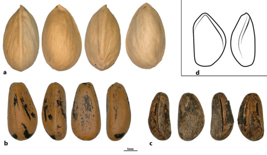 (a)—modern cultivated pistachio nut; (b,c)—modern pine nuts; (d)—figure from Pefkakia-Magoula, Greece (recreated from [95]) formerly identified as true pistachio.