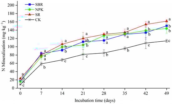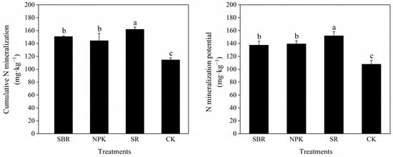 The accumulated mineralized nitrogen content and potentially mineralizable nitrogen content of the three fertilization treatments on the 49th day were significantly higher than that of the CK treatment (Figure 3). Among the fertilization treatments, the accumulated mineralized nitrogen content and potentially mineralizable nitrogen content under SR were significantly higher than that of SBR and NPK. However, there were no significant differences in cumulative mineralized nitrogen content and potentially mineralizable nitrogen content between SBR and NPK, and cumulative mineralized nitrogen was lower under NPK, though with no difference.